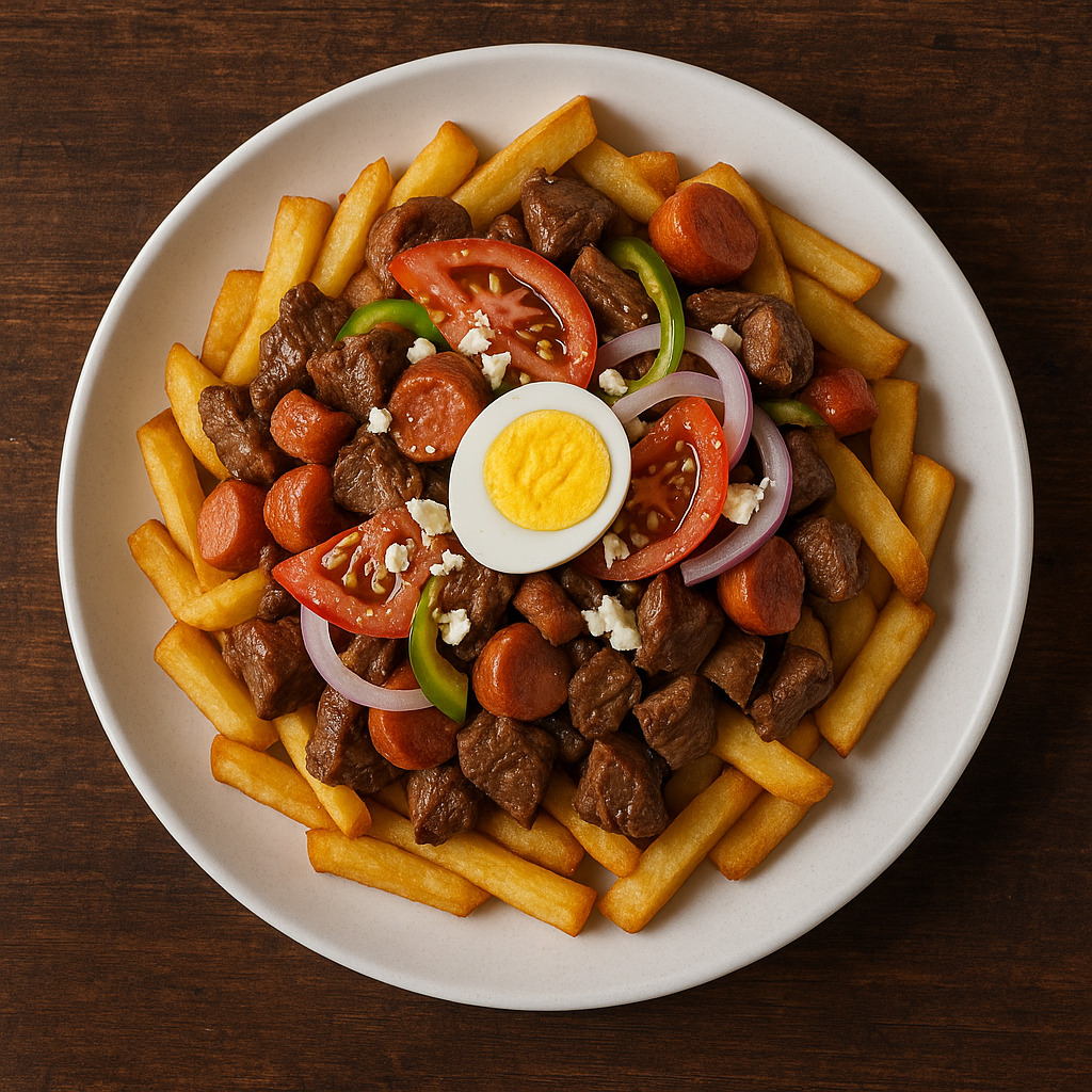 Trozos de res y salchicha sobre papas fritas, locoto, cebolla, tomate y huevo. Un clásico cochabambino.